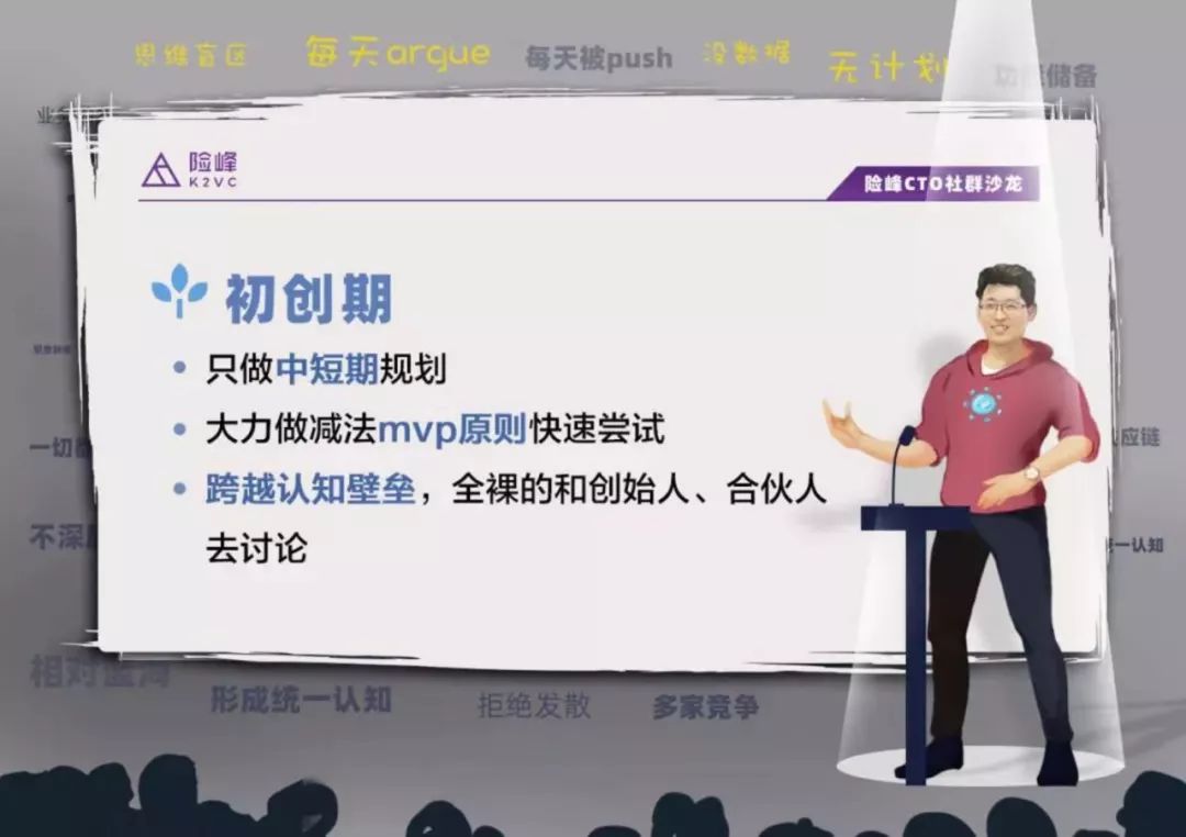 比如今天,各个公司CTO大家围坐在这里脑暴,可能都会犹豫,这个问题我问还是不问?这些小纠结都是人性。但是针对初创期,必须拿掉自尊、脸面等,反人性的去和你的创始人、合伙人沟通。