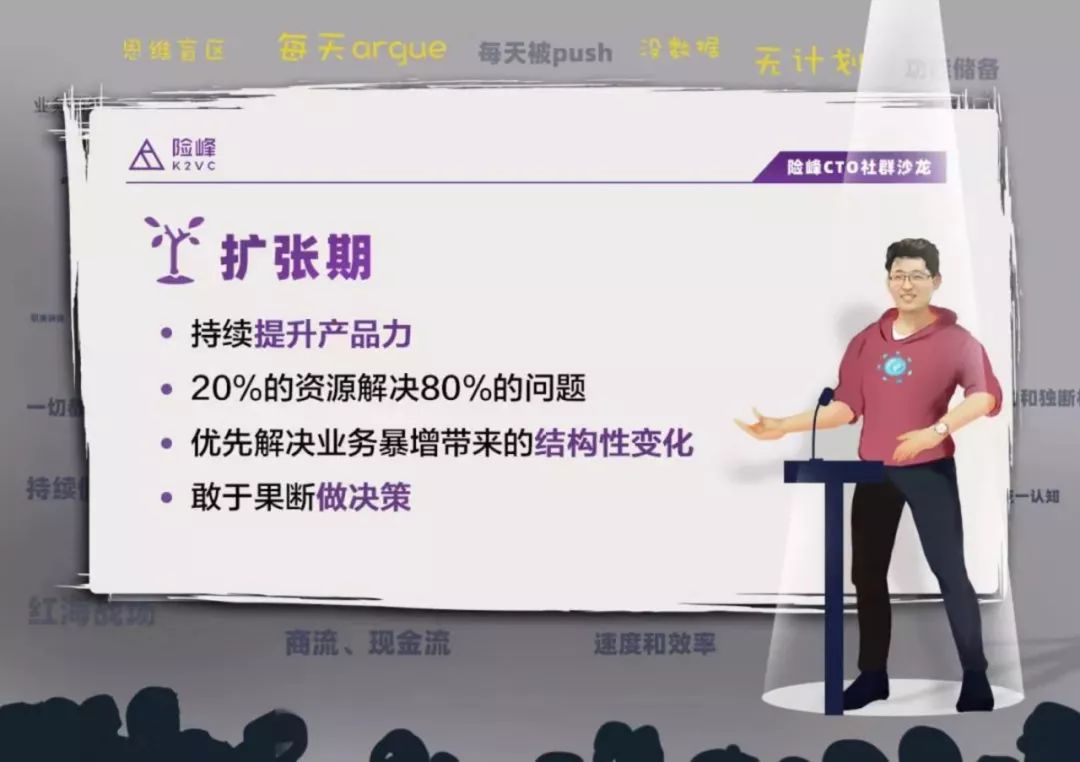 扩张期的首要目标是速度和效率,并要解决大量积累的遗留问题,这种情况下要设定优先级解决业务暴增及遗留问题,同时一定程度上不能被成本限制,否则会造成更大灾难。