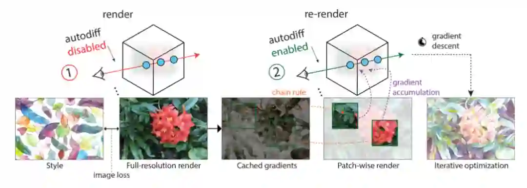 同时,他们还提出了一种新的延迟反向传播(deferred back-propagation)方法——利用全分辨率渲染图像上定义的风格损失来优化内存密集型的辐射场。