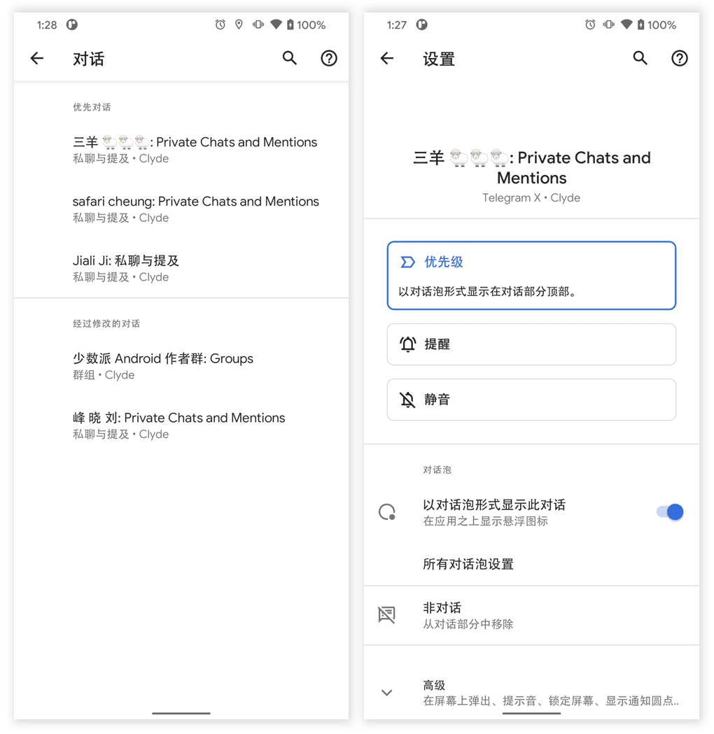 针对这个多出来的「对话」消息,Google 还特别引入了「优先对话(Priority conversations)」和「对话泡(Bubbles)」机制,对话泡即此前我们已经有过介绍的「聊天气泡」。当特定联系人的对话消息被选定为优先对话后,对应的消息通知在通知栏中将直接显示为联系人头像而非应用图标。