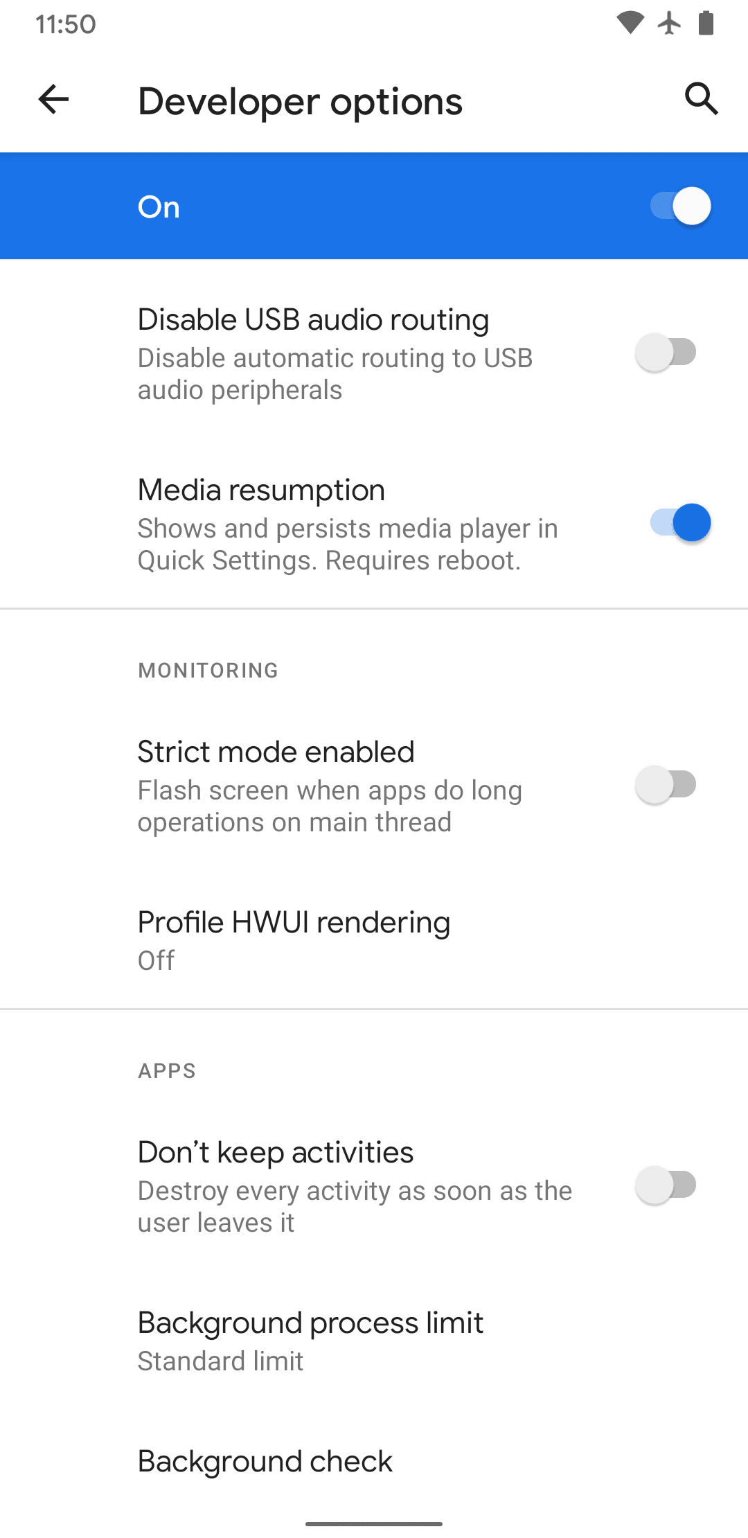 在 Android 11 Beta 中,这个新版本的控制中心也并非默认开启的,如果你想体验,需要在开发者选项中手动选择开启「Media resumption」并等待手机 UI 界面重启刷新。