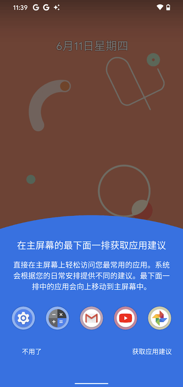 在首次设置 Android 11 时,桌面启动器便会提示你是否需要在主屏幕的最下面一排(Dock)获取人工智能加持下的应用建议。在开启后,系统推荐的应用会以带浅色外圈的样式出现以示区别。