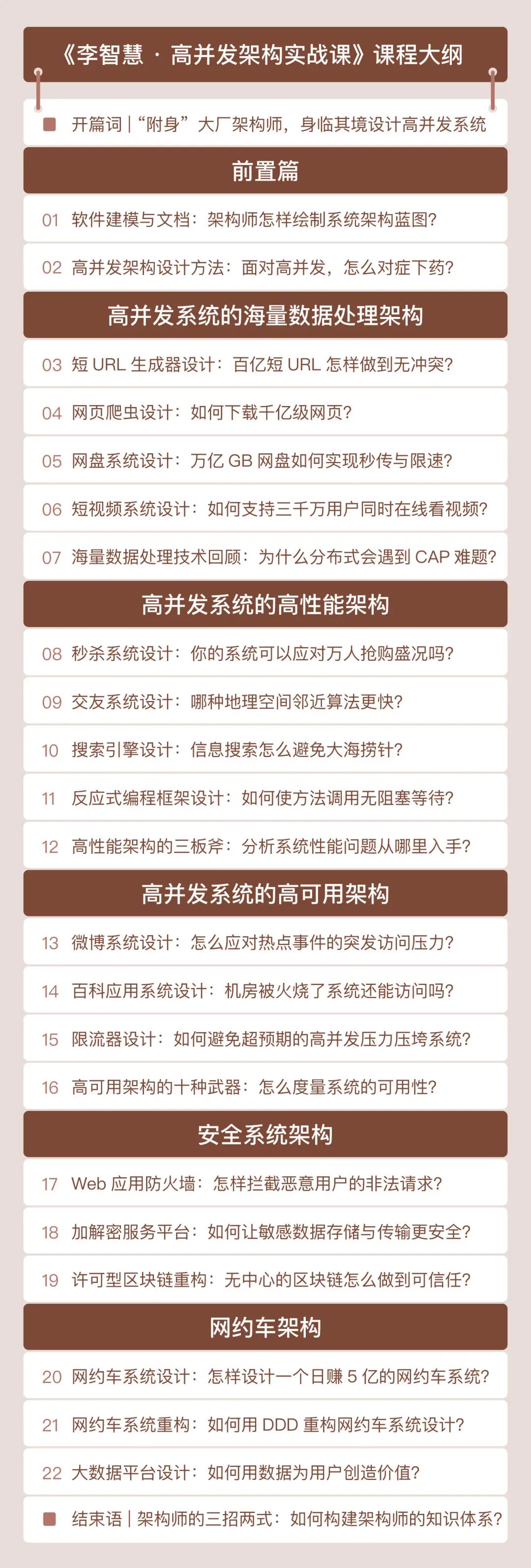 通过这种方式,打造“架构设计的现场感”,这个方法来自上新专栏《李智慧 · 高并发架构实战课》,专栏最吸引我的地方,就是李智慧拆解了 15+ 典型的系统架构案例,并针对这些知名的大厂应用重新进行设计(不是分析现有的应用是如何设计的),以此让你带入架构师视角,体会真实的系统设计场景,集众家技术之所长,并尝试自己进行软件建模,写架构设计文档。
