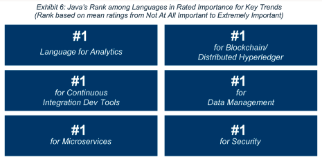 该研究报告考察了当今主流的 20 多种顶级编程语言,发现 Java 仍然是顶级技术趋势中排名第一的语言,也是开发者信任的解决安全问题的最高评级语言。