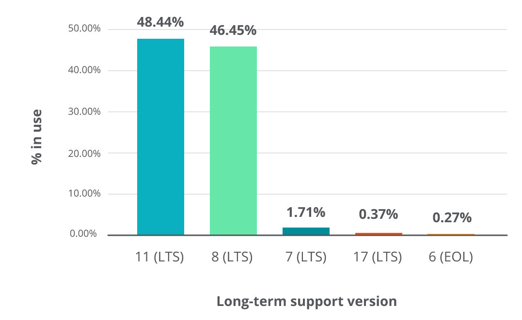 每年在 Java 最新版本到来之际,也有不少人陷入了“升级 or 不升级”的纠结中。根据知名科技公司 New Relic 之前发布的《Java 生态系统状况报告》显示,2018 年 9 月发布的 Java 11 是目前最受欢迎的 Java 版本(48%),其次是 2014 年 3 月发布的 Java 8(46%),两者都是长期支持(LTS)版本。