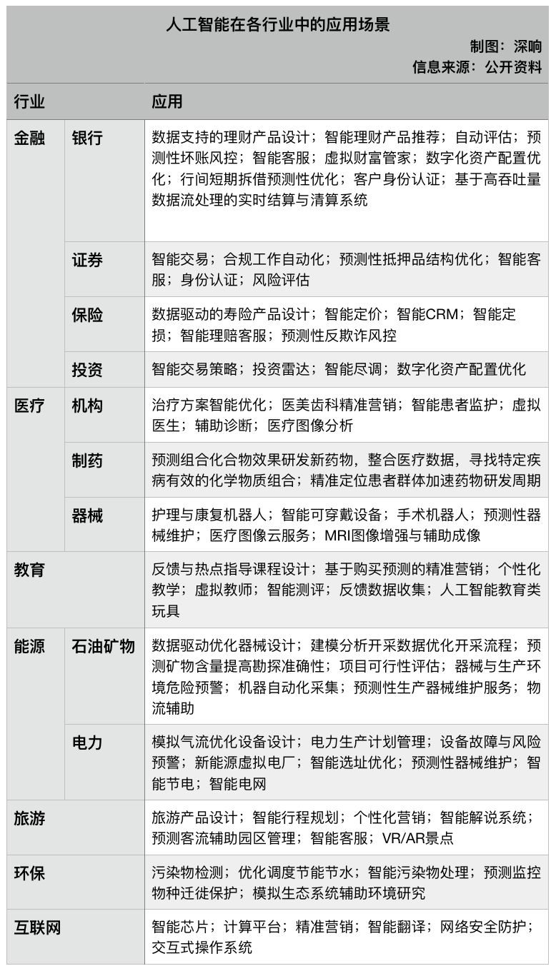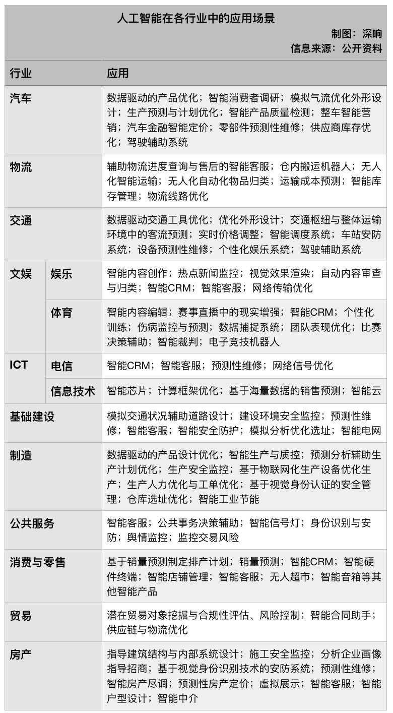「深响」将现有人工智能在各行业的应用场景总结如下: