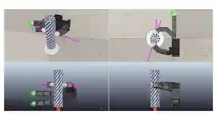 图1 上图是本文在V-REP中模拟的Allegro机械手,任务是尽可能使圆柱逆时针旋转。