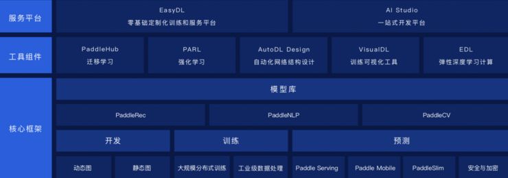 第二,PaddlePaddle 不仅仅包含深度学习框架,而是提供一整套紧密关联、灵活组合的完整工具组件和服务平台,更加有利于深度学习技术的应用落地。目前 PaddlePaddle 完整具备了端到端的平台能力。去年我们就将 PaddlePaddle 定位为深度学习平台,我们布局也是很早的。所以,我们出的各种相应的配套工作都做得非常完善,开发者能在实打实的应用里体验到,在这个方面 PaddlePaddle 和其他框架相比形成了自己的特色。