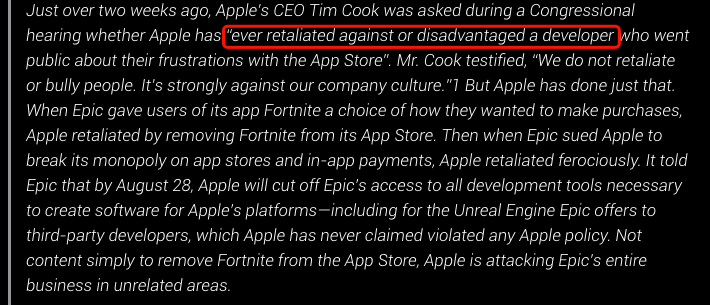 在刚过去的反垄断听证会上,库克还说「苹果从来不会报复对App Store有不满的开发者,这与苹果公司的文化是背离的」。