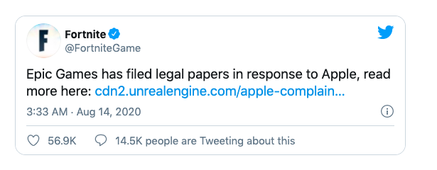 上周,当苹果就直接支付方式与 Fortnite 达成协议时,苹果官方声明「我们将尽一切努力与 Epic 公司合作,解决这些违规问题,这样他们就可以将 Fortnite 重新纳入 App Store」。