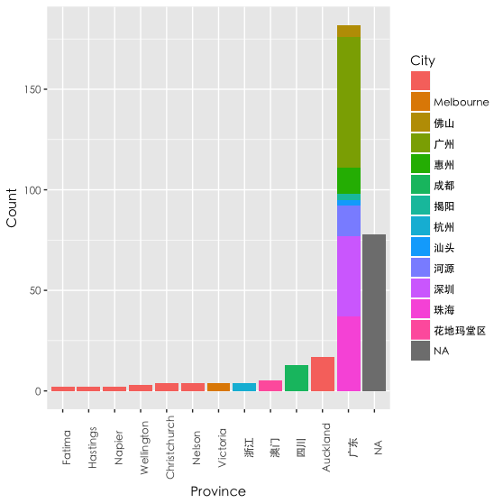 看来我大部分的朋友都是在广东的,其中广东的朋友大部分集中在广、深、珠,第二名是在奥克兰, 接着是四川、澳门等。灰色的NA值是指没有设置自己所在地的朋友,一共有70多人。另外,在国外的朋友由于微信的设置问题(很多是直接跳过省份,只有城市可以选择的),很多国外的城市被误当成了省份。