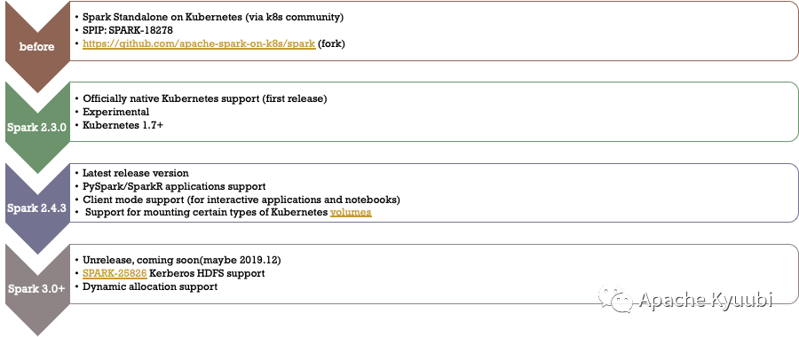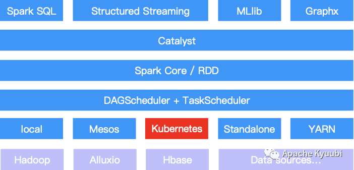 从 Spark 整体计算框架层面来看,只是在资源管理层面多支持了一种调度器,其他接口都可以完全复用。一方面 Kubernetes 的引入和 Spark Standalone、YARN、 Mesos 及 Local 等组件形成了一个更为丰富的资源管理体系。