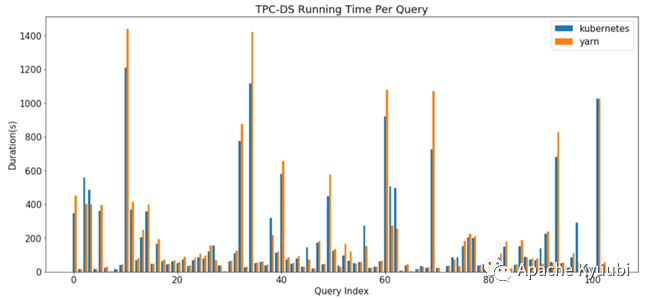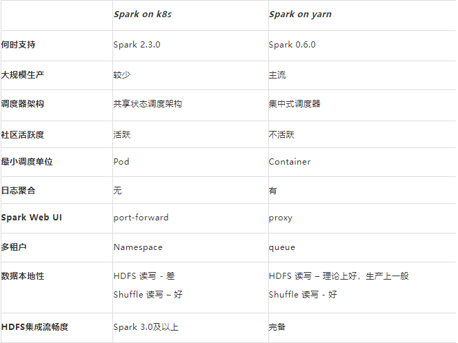 从原理上,无论是 Kubernetes 和 YARN 都只起资源调度的作用,不涉及计算模型和任务调度的变化,所以在性能上的差异应该是不显著的。从部署架构上,Spark on Kubernetes 一般选择存算分离的架构,而 YARN 集群一般和 HDFS 耦合在一起,前者会F在读写 HDFS 时丧失“数据本地性”,这个由于网络带宽因素影响可能会影响性能。从存算耦合架构诞生之初经过 10 年左右的发展,随着网络的性能增长,各种高效的列式存储格式及压缩算法的加持,这点影响微乎其微。