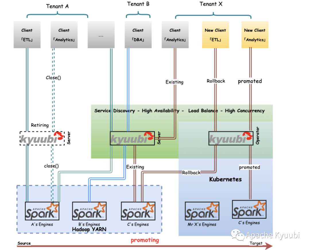 一般而言,大部分企业都会有很多离线的 Hive 或者 Spark 任务跑在 YARN 集群上,如何将大量的历史任务平滑地迁移到 Kubernetes 上也是让人头疼的问题。Kyuubi 的服务化方案,可以通过服务发现机制,提供负载均衡节点,在服务高可用的基础上,来平滑地过渡。对于个别异常迁移任务,我们也可以方便地 Rollback 到 老集群上保障执行,也留给我们定位问题的时间和空间。