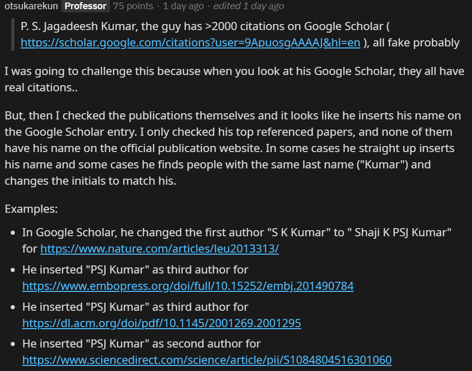但很快就有人扒出来,他的被引量是假的。有网友指出:Jagadeesh Kumar「发表」的文章,看起来是在 Google Scholar 的条目中添加了自己的名字,而官方出版网站上都没有他的名字。