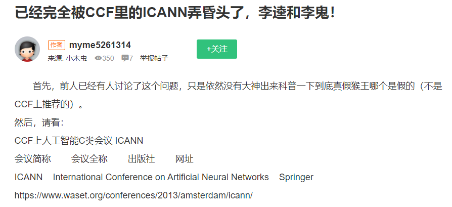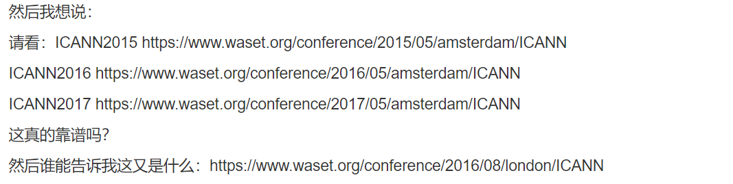 其实,ICRA 并不是第一个被冒充的 AI 顶会。早在几年前就有人在小木虫论坛上表示,自己被网上出现的多个 ICANN 会议搞晕了。在最新版《中国计算机学会推荐国际学术会议和期刊目录》中,ICANN 是 Springer 下属的人工智能 C 类会议,与 ACML、NAACL 等会议同级。这位发帖者表示,他在网上发现了多个和 ICANN 相关的奇怪网址,和 Springer 给出的差别很大,不知道哪个是「李逵」,哪个是「李鬼」。