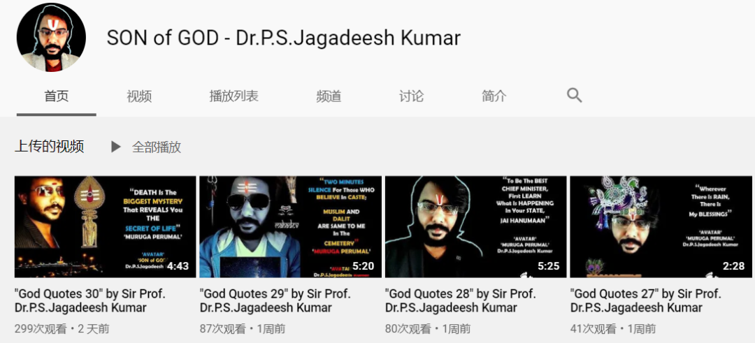 Jagadeesh Kumar 对自己的「营销」还不止这些。在 YouTube 上他还以「上帝之子」自居: