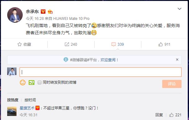 昨日,余承东发微博辟谣称:“飞机刚落地,看到自己又被转岗了。感谢朋友们对华为终端的关心关爱,服务消费者还未拼尽全身力气,岂敢先溜”。