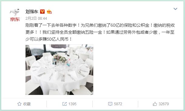 近日,刘强东通过其个人微博表示为京东员工缴纳了60亿的保险和公积金,坚持全员全额缴纳五险一金,并称如果通过劳务外包或者少缴,一年至少可以多赚50亿人民币!