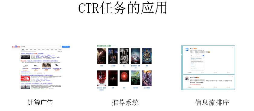 CTR 预估比较通用,所以它的应用范围就非常广,张老师举了 3 个例子,分别是计算广告、推荐系统和信息流排序。