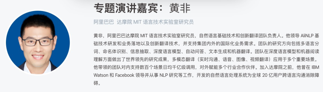 黄非老师在 NLP 领域有着多年的研究,他带领的团队支持数百个场景日均千亿级调用。同时,在阿里多、全、广的业务线和聚合许多顶级人才的研究加持下,NLP 技术的应用经验也相较更丰富、更有参考性。