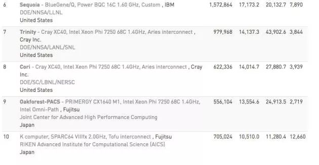 排名第九的是Oakforest-PACS,是安装在日本先进高性能计算联合中心的富士通PRIMERGY CX1640 M1,HPL为13.55 petaflops。它也是使用英特尔“Knights Landing”Xeon Phi处理器。