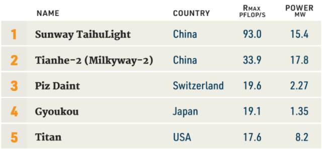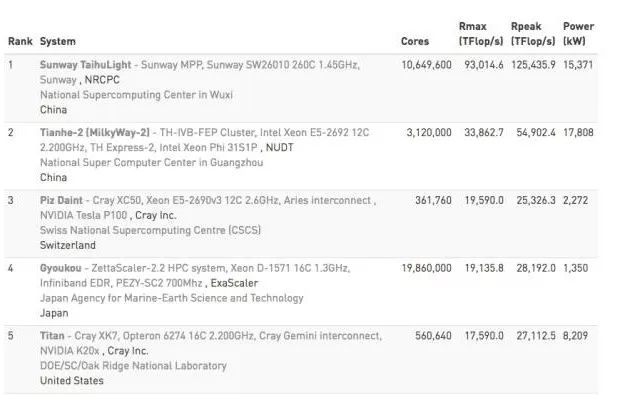 由中国国家并行计算机工程技术研究中心(NRCPC)开发,部署在无锡国家超级计算中心的神威·太湖之光系统第四次蝉联第一,高性能Linpack(HPL)得分93.01 petaflops。