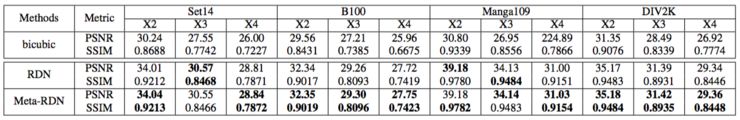 表 3:当缩放因子为 X2, X3, X4,Meta-RDN 与 RDN 的对比结果