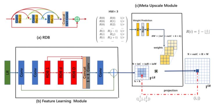 本文选用 RDN 作为特征学习模块,如图 1(b)所示。这里,本文聚焦于 Meta-Upscale 的公式化建模。