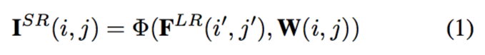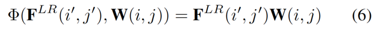 Location Projection 和 Weight Prediction 之后要做的就是把特征映射到 SR 图像上的像素值。本文选择矩阵乘积作为特征映射函数,表示如下: