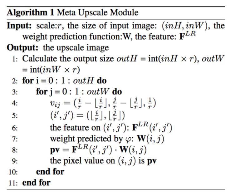 对于待预测 SR 图像上的每个像素点(i, j),本文基于缩放因子 r 将其投射到 LR 图像上,Meta-Upscale 模块把与坐标和缩放因子相关的向量作为输入,并预测得到滤波器权重。对于待预测 SR 图像上的每个像素点(i, j),LR 图像上相应投影点上的特征和预测得到的权重卷积相乘就能预测出(i, j)的像素值。