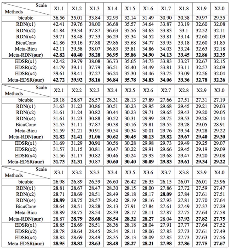 同时,Meta-RDN 也由于 Meta-Bicu, 这是因为对于在特征图插值,缩放因子越大,有效的 FOV 越小,性能下降越多。但是,在 Meta-SR 中,每个缩放因子具有相同的 FOV。受益于 Meta-Upscale,相较于其他 baselines,Meta-RDN 几乎在所有缩放因子上取得了更优性能。