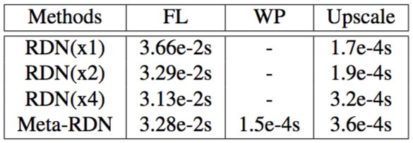 在表 2 中,FL 表示 Feature Learning 模块,WP 表示 Meta-SR 的 Weight Prediction 模块,Upscale 是 Upscale 模块。测试是跑在 B100 上,测试的缩放因子是 2。