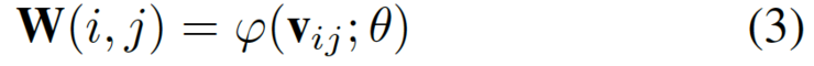 其中 v_ij 是与 i, j 相关联的向量,也是权重预测网络的输入,其可表示为: