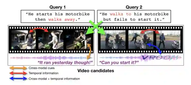 进行视频文本检索的关键是学习精确的视频-文本表示,并建立相似度估计。目前的方法主要存在两个方面的缺陷:1)没有充分利用好视频中动作、音频、语音等各个模态,从上图中可以看出,从所有组成模态中联合提取的线索比单独处理每个模态更具信息性;2)没有充分考虑视频的时间性,由于数据集中的视频时长不一样,目前的方法通常是通过聚合视频中不同时刻提取的描述,从而丢弃长期时间信息。