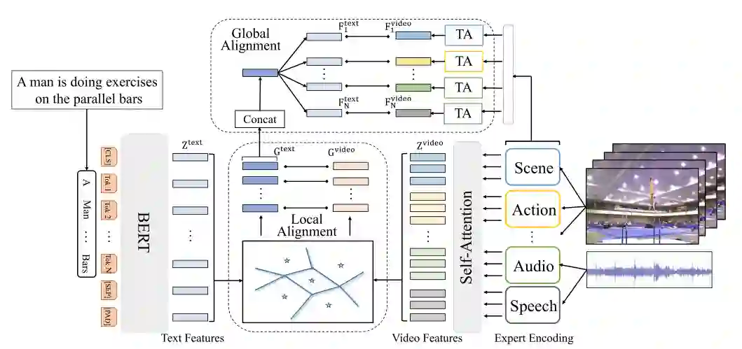 对于全局对齐,在不同专家的时间维度上进行 max-pooling,得到全局视频聚合特征;用对齐后文本的 concat 结果来生成 N 个全局文本聚合特征,最后计算文本和视频的全局特征的相似度。