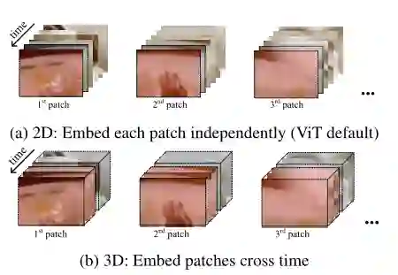 上图展示了本文的模型框架,作者将视频看做一系列图片的集合。对于视频编码,作者采用了 CLIP 中预训练的 ViT,Patch Embedding 的时候采用了以下两种方式(2D:不考虑时间的信息,对每一张图像分别 embedding;3D:考虑时间信息,相邻的帧一起 embedding):