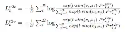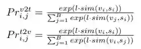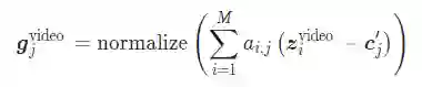 对于局部对齐,作者首先设置了 K+1 个共享聚类中心 c(由于视频和文本共享相同的聚类中心,因此有利于将视频和文本在相同的语义空间中进行对齐),然后根据计算每个聚类中心和每个特征之间的相似性,进行并更新特征,视频更新方式如下所示(文本特征更新方式类似):