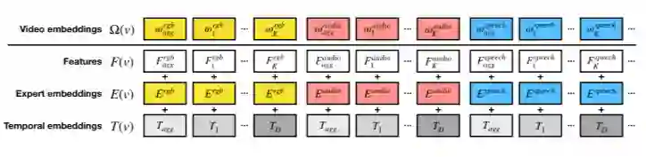本文的结构如上图所示,本文的特征提取用的是预训练的 BERT,视频的特征用的是不同的预训练好的“专家”模型来提取不同模态的特征,每个模态采用 max-pooling获得一个聚合特征,然后将提取的特征和专家 embedding、时间 embedding 相加能到最终的视频特征(如下图所示)。