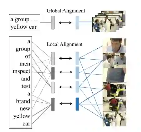 在本文中,作者提出了一个局部-全局的序列对齐方法。从局部角度,作者并没有进行一对一的成对匹配,而是设置了共享主题,这些主题在图像和文本中共享,然后最小化相同主题的图像和文本特征之间的距离,实现局部的对齐。从全局角度,只需要将全局的视频和文本特征进行相似度比较,作为局部对齐的一种补充度量和额外监督。