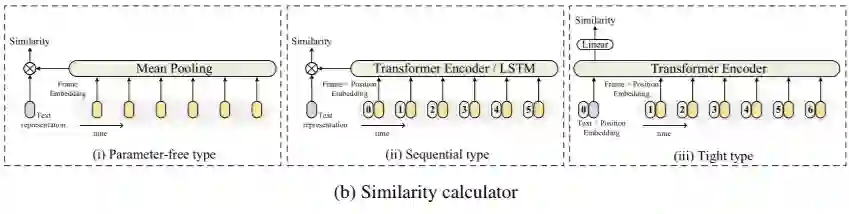 这样,我们就获得了带时间序列信息的视频表示和文本表示,然后作者采用了三种方式进行了视频和文本的相似度计算,如上图所示,总的来说前两种的方法的性能要由于第三种方法,可能是因为第三种方法引入了太多随机初始化的参数,从而破坏了原来 CLIP 已经学好的信息。