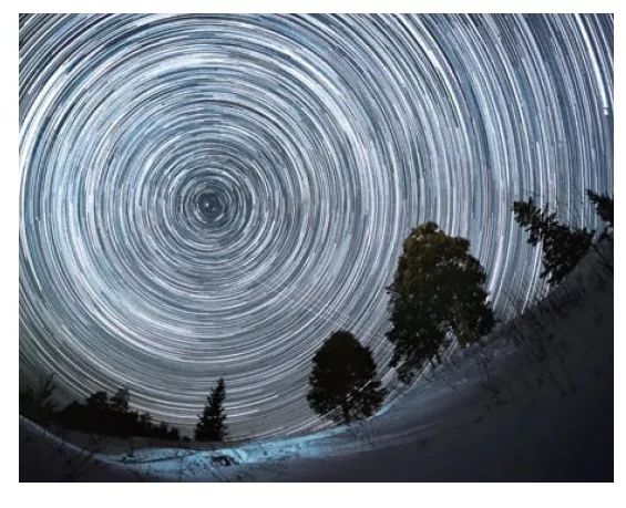 天上的星体看起来杂乱无序,但即便如此,它们的运动方式也蕴含着某种图形。每天晚上,它们都会沿着圆弧轨迹绕北极星运转。这幅图告诉我们,旋转的不是天空,而是地球。当地球旋转时,天上的星星似乎也在旋转。北极星看上去位置保持不变,是因为它与地球的地轴正好对齐