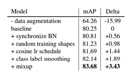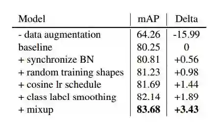 表 2:对 YOLOv3 的训练精调,在 Pascal VOC 2007 测试集 416×416 图像上评估。
