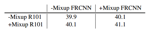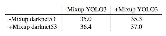 表 1:在 Pascal VOC 2007 测试集上用 YOLOv3 验证多种混合方法的有效性。加权损失表示总体损失是多个比例为 0 比 1 的目标的损失之和,该比例是基于它们在原始训练图像中所属的图像混合比例算出的。