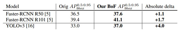 表 4:利用 bag of freebies(BoF) 方法取得的进步,在 MS COCO 2017 验证集上评估。