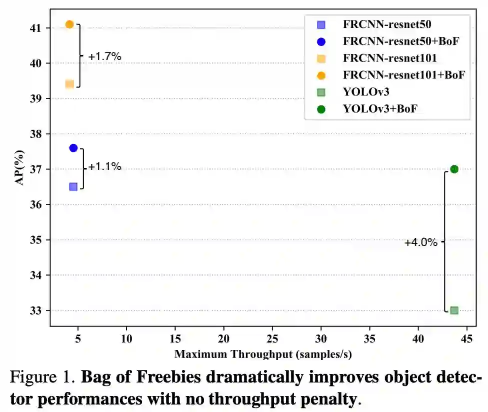 图 1:Bag of Freebies 在不牺牲推理速度的前提下,显著提高了目标检测器的性能。