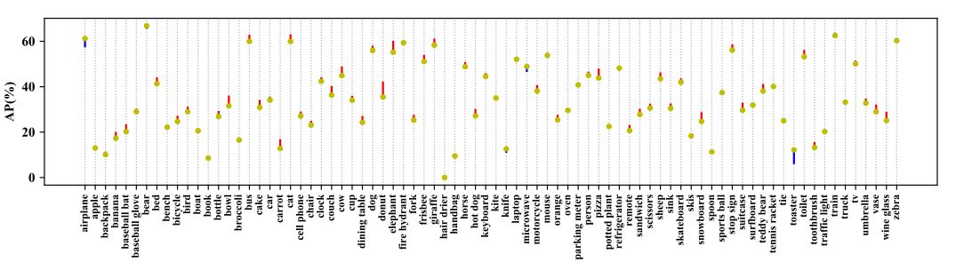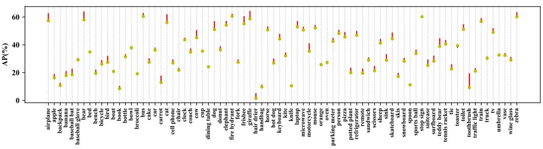 图 9:Faster-RCNN resnet 50 在 C0C0 数据集 80 个类别上的 AP 分析。红线表示使用 BoF 的性能提升,蓝线表示性能下降。