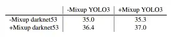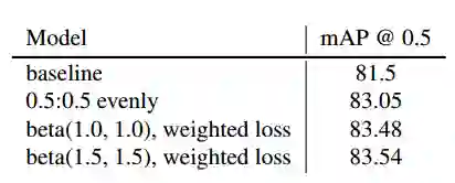 我们还通过实验利用 YOLOv3 网络在 Pascal VOC 数据集上测试了经验混合比分布。表 1 显示了采用检测混合方法的实际改进情况。α和β都等于 1.5 的β分布略优于 1.0(相当于均匀分布),也优于固定均匀混合。