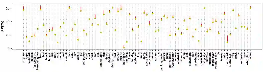 图 8:YOLOv3 在 COCO 数据集 80 个类别上的 AP 分析。红线表示使用 BoF 的性能提升,蓝线表示性能下降。