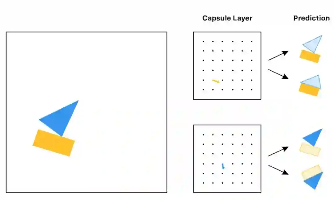 如下是两个胶囊层(一个用来处理长方形一个用来处理三角形)和 2 个传统像素输出的一个简化版对比: